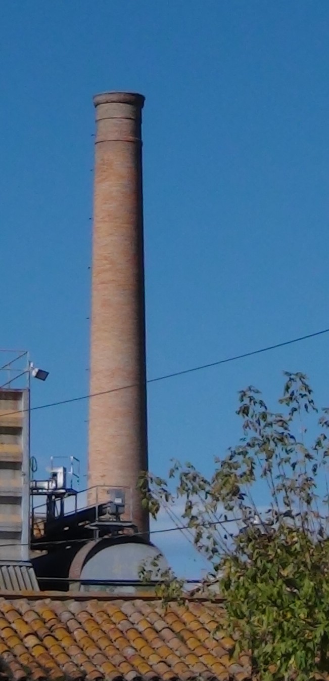 La xemeneia està edificada amb els clàssics maons trapezoïdals aplantillats de terra cuita vermella, que en aquell temps es feien a ma emprant motlles de fusta de diferent mida segons fos la circumferència del tram que estaven edificant.