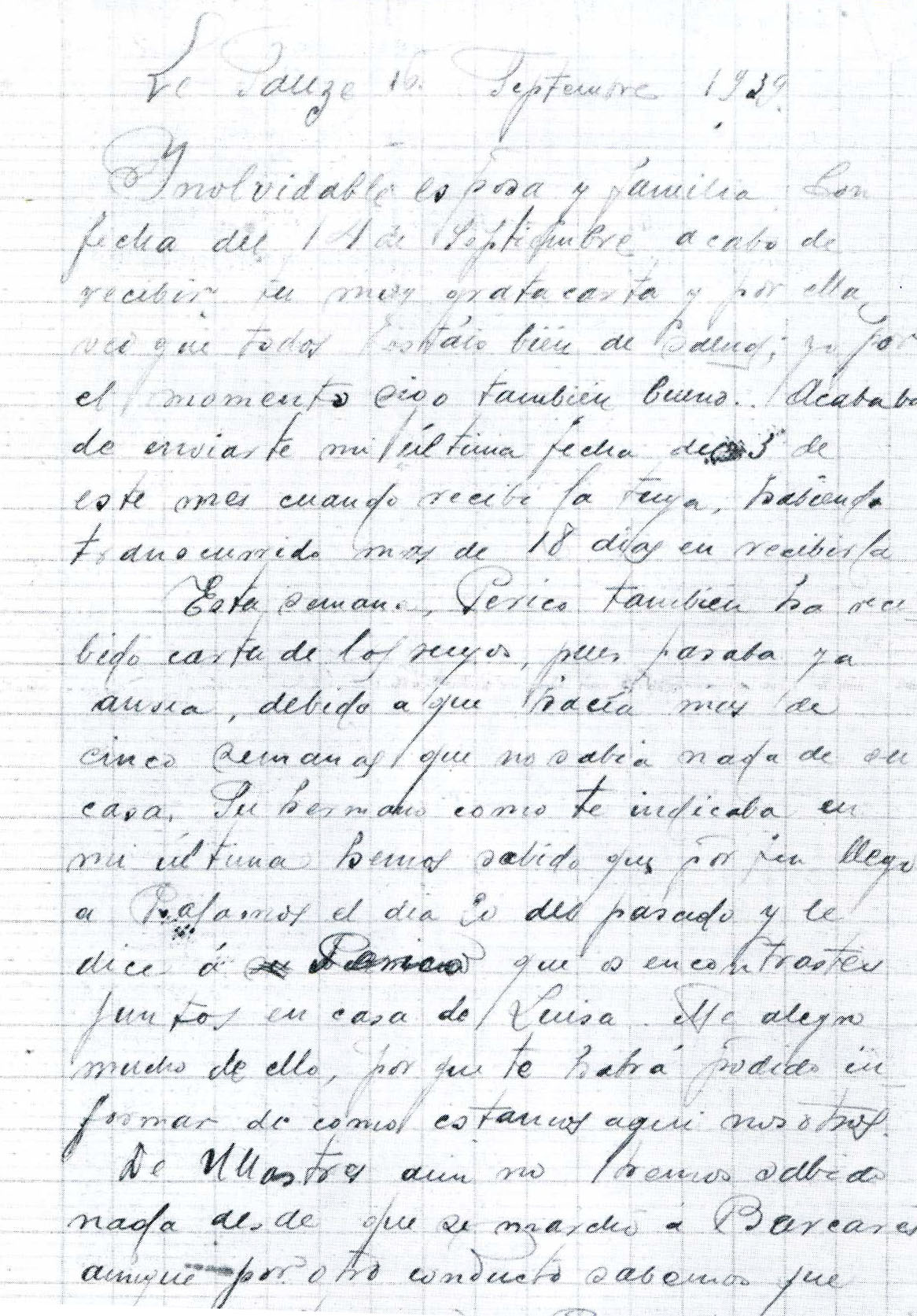 “Doncs, com et deia, el meu pare en creuar la frontera va anar a parar a un camp de refugiats a Le Sauze proper a Gap, -o tal vegada era Le Salses. Mira, aquí tinc una carta escrita per ell, alguns dies encara la llegeixo.”