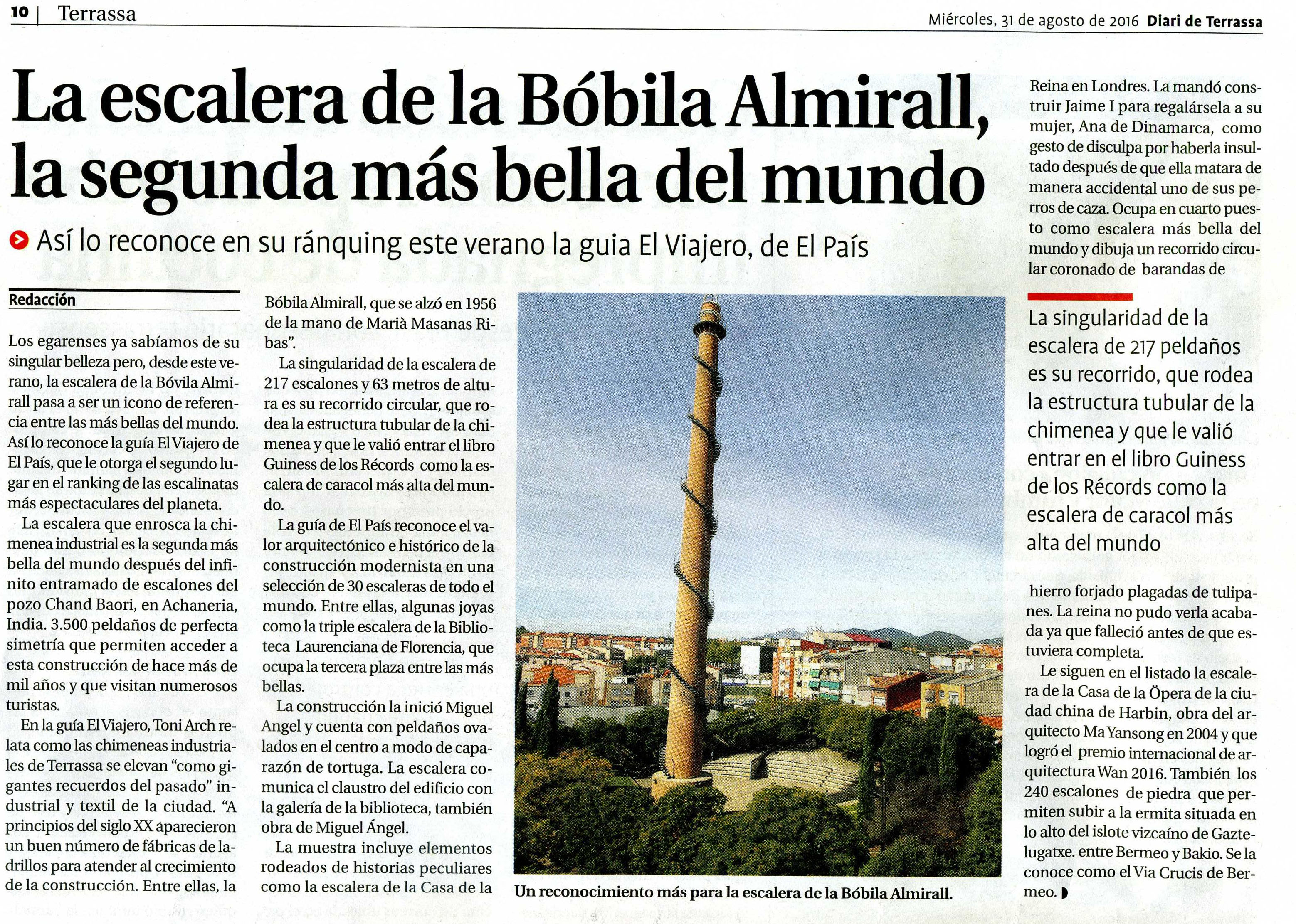 La segona escala més votada va ser la de la xemeneia de la bòbila Almirall de Terrassa, estructura edificada l’any 1956. Fa 63,25 metres d’alt i l’envolta una escala de cargol de 217 esglaons que s’enfilen fins a una plataforma superior amb vista panoràmica sobre la ciutat.
