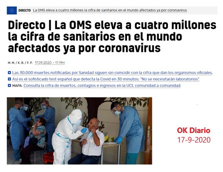 La emisora Ser directo ultima hora, del dia 8 de abril del 2020 informava que en España se habian infectado del Covid-19, 19.000 profesionales de los cuales 26 habian fallecido. Nos presentan también una breve sintesis del trabajo profesional que habian desarrollado, hecho meritorio porque reconocer su actividad en la medicina y sale de las cifras meramente estadisticas.