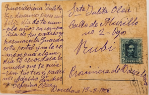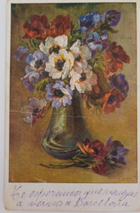 A la postal hi ha impresa una pintura d’un gerro amb flors, signada pel seu autor, tot i que no reconec el nom. Al dors, escrit a mà i amb lletra entenedora, es veu que anava adreçada a Julita Olea, que vivia al carrer Murillo, núm. 2, baixos, a Rubí. El text diu:
