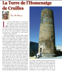 El juny de 2018 va sortir publicada la Revista Baix Empordà número 61. El tema central era dedicat a les torres de guaita i defensa de la comarca, i vaig tenir l’oportunitat de col·laborar-hi amb una crònica sobre la Torre de l’Homenatge de Cruïlles.