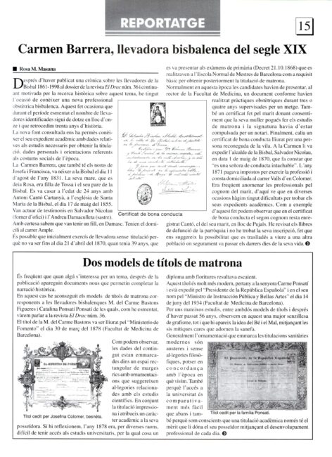 A la revista el Drac de la Bisbal vàrem escriure un article sobre les antigues llevadores que havien exercit a la vila, més tard vàrem localitzar a Carmen Barrera Pujals, motiu pel que en vàrem fer una breu crònica per donar testimoni d’ella. Ara hem pensat incloure la informació que vàrem publicar a la revista el Drac número 45 de l’any 2002 en aquest mitja,