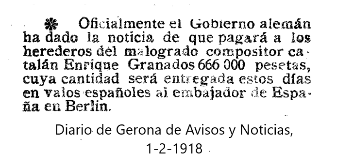 Adjunto un retall de premsa del Diario de Avisos y Noticias del dia 1 de febrer de 1918, on es comunicava que el govern alemany pagaria als beneficiaris del compositor la quantitat de 666.000 pessetes, mitjançant l’ambaixador d’Espanya a Berlín.