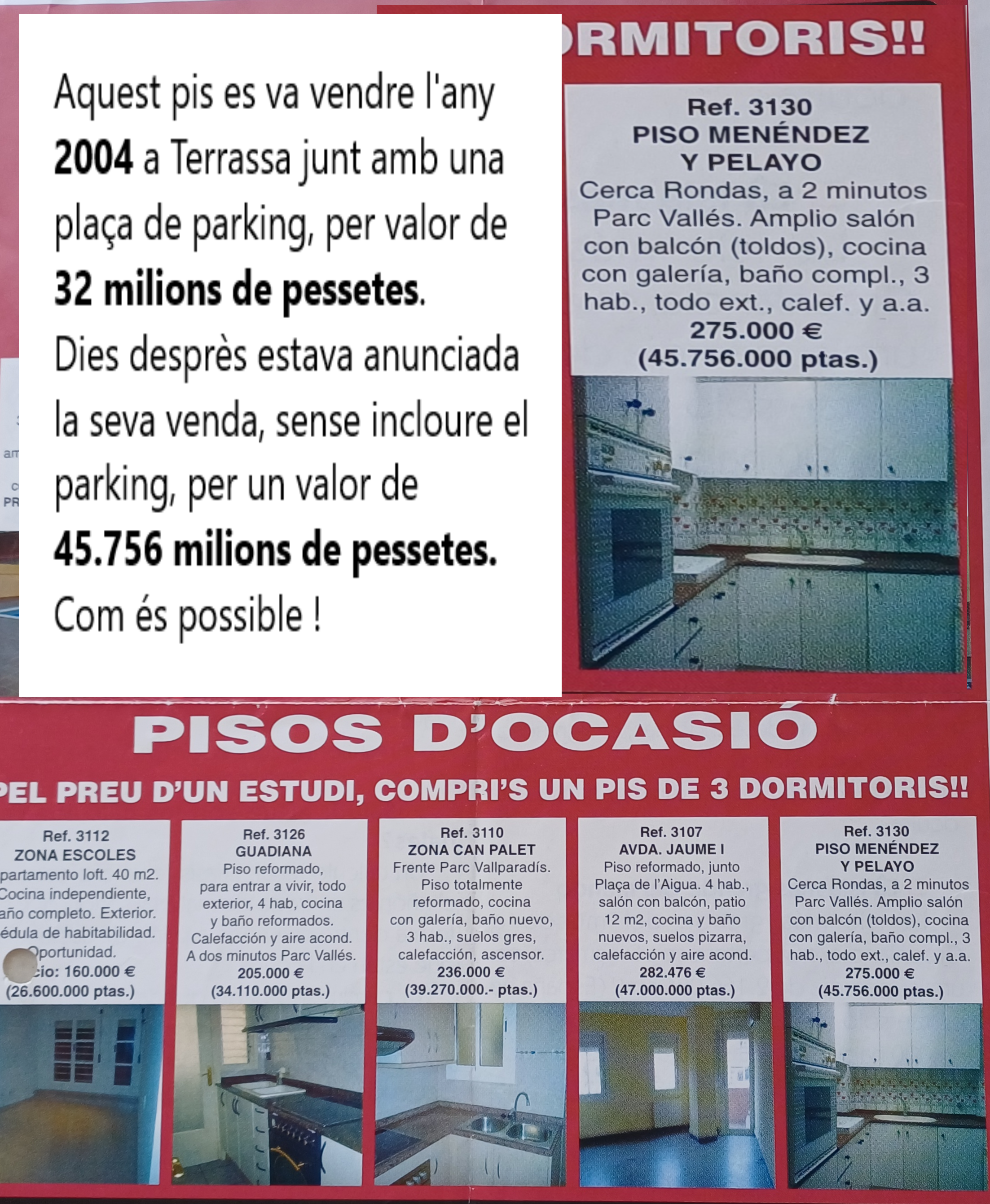 Pocs dies desprès, aquest mateix pis sense que s’especifiqués disposava de pàrquing, sortia a un diari divulgatiu i adjuntant una imatge de la cuina que es posava a la venta per 45.756.000 milions de pessetes.