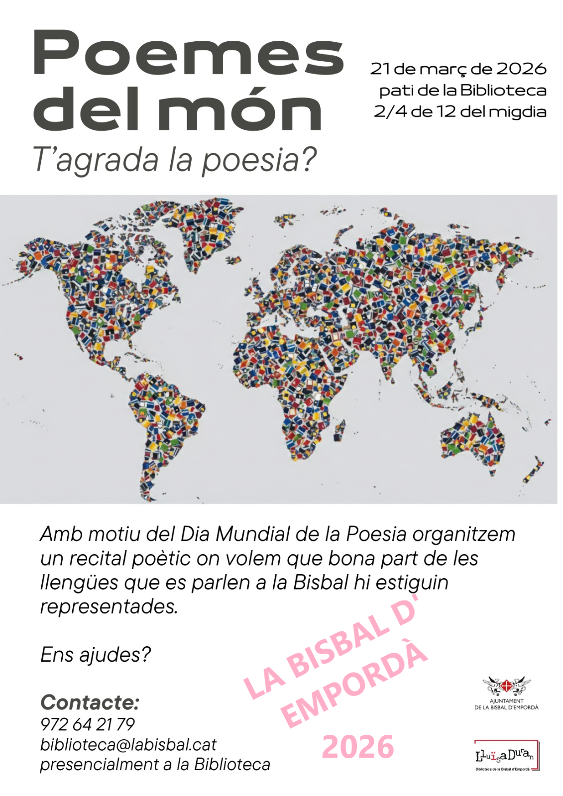 Els recitals van ser organitzats per la Biblioteca Municipal i el Departament de Cultura de l’Ajuntament fent-se al mateix pati de la Biblioteca. Alguns poemes van anar acompanyats de musica feta pels alumnes de l’escola Conrad Saló de la Bisbal que independentment també van cantar algunes cançons.