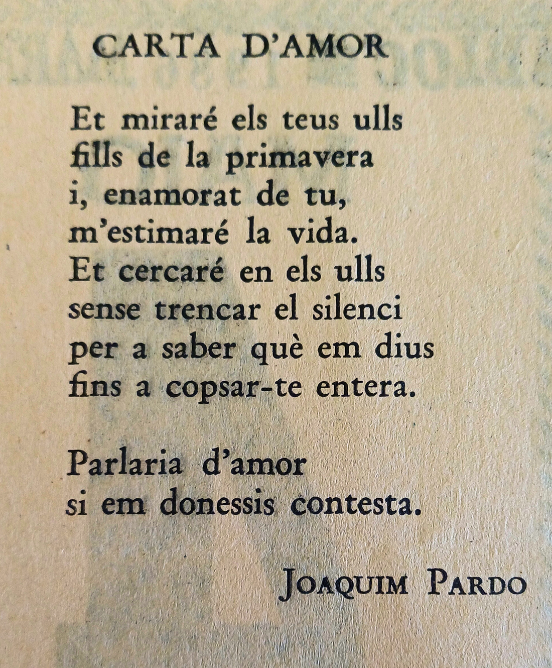 De segur que el vaig reservar perquè hi havia una poesia del poeta Joaquim Pardo titulada Carta d’amor i em va agradar. Adjunto l’imatge del full.