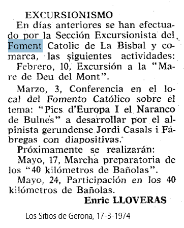 L’any 1974 la premsa dona noticies de l’activitat del Centre Excursionista del Foment com també d’una conferencia.