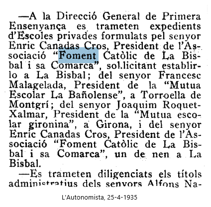 L’any 1935 el president del Foment Catòlic, Enric Canadas gestiona la tramitació d’expedient per la petició d’escoles privades. Adjuntem retall del diari.
