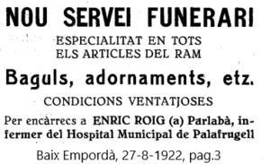 Hem localitzat a l’hemeroteca digitalitzada de l’Arxiu Municipal de Palafrugell un rètol publicitari que ens permet saber que a l’hospital i treballava també l’infermer Enric Roig.